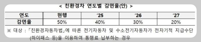 국토교통부는 친환경차에 대한 통행료 감면을 3년 연장하되, 감면율은 점진적으로 축소할 계획입니다. 2017년부터 시작된 이 제도는 친환경차 보급을 촉진하기 위해 고속도로 통행료를 50% 감면해 주는 정책으로, 그동안 두 차례 연장되었습니다. 그러나 고속도로 통행료가 9년째 동결되어 유지관리 재원이 제한적이어서 감면 비율을 매년 축소하기로 하였습니다. 이렇게 확보된 재원은 장애인 렌트차량 통행료 감면 등 취약계층 지원을 위한 제도에 활용될 예정입니다.