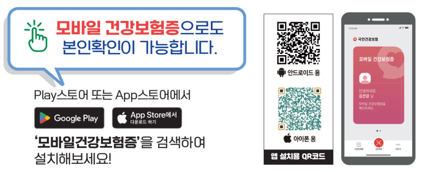 1. 앱설치 : 구글 플레이, 애플 스토어에서 '모바일건강보험증' 검색 후 설치