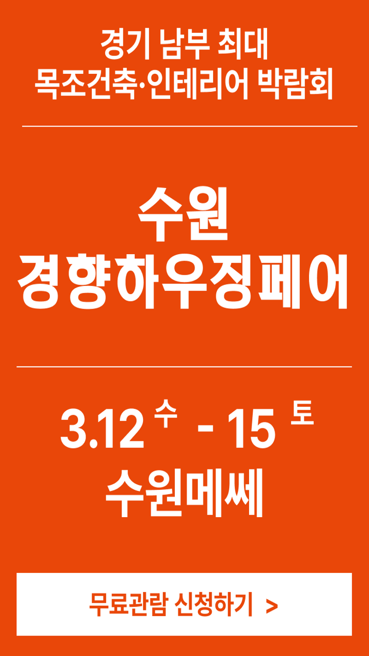 경기 남부 최대의 목조건축·인테리어 박람회 '2025 수원경향하우징페어'가 3월 12일(수)부터 15일(토)까지 수원역 수원메쎄에서 개최됩니다.