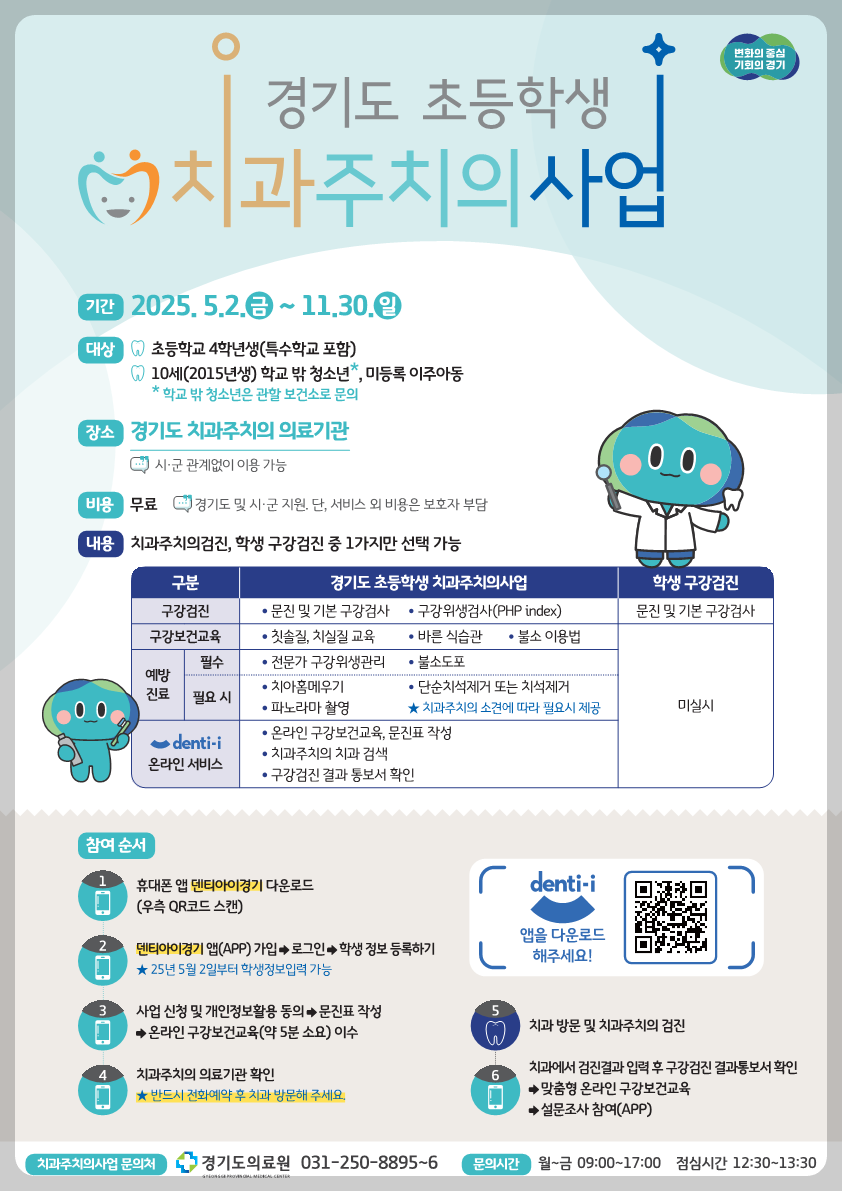 2025년 경기도 초등학교 4학년 생이라면, 11월 30일까지 꼭 무료 치과 검진을 받으세요! ‘덴티아이경기’ 앱으로 쉽고 빠르게 참여 가능합니다.