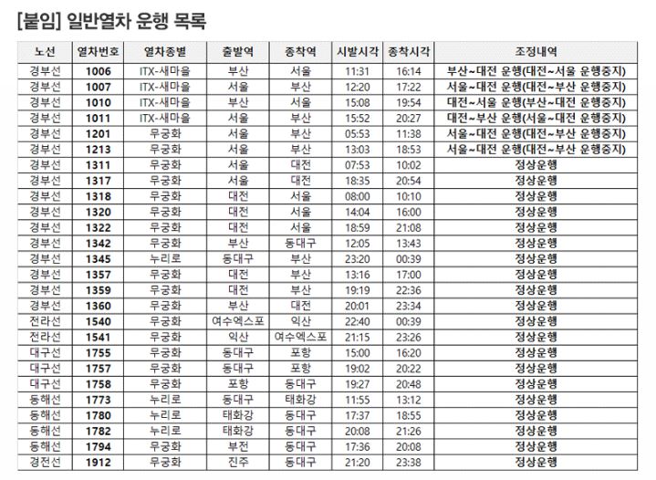 ▶ 일반열차 : 경부, 전라, 대구, 동해, 경전선 일부 열차 운행 중이지만,