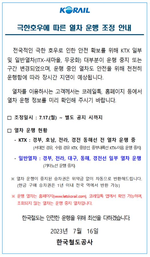 비가 많이 내려 모두가 불편을 겪겠지만 소중한 생명을 잃은 분들께 위로와 유감을 표하며 시시각각 변경되는 열차 조정 내역은 업데이트 즉시 공유예정입니다.