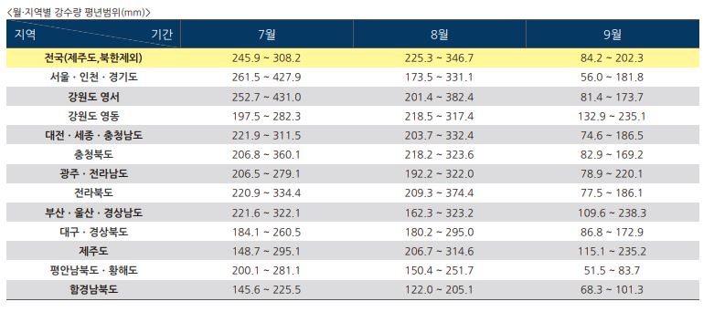 강수량 : 7월과 8월은 평년 (7월 245.9~308.2mm, 8월 225.3~346.7mm)과 비슷하거나 많을 확률이 각각 40%, 9월은 평년 (84.2~202.3mm)과 비슷할 확률이 50%입니다.