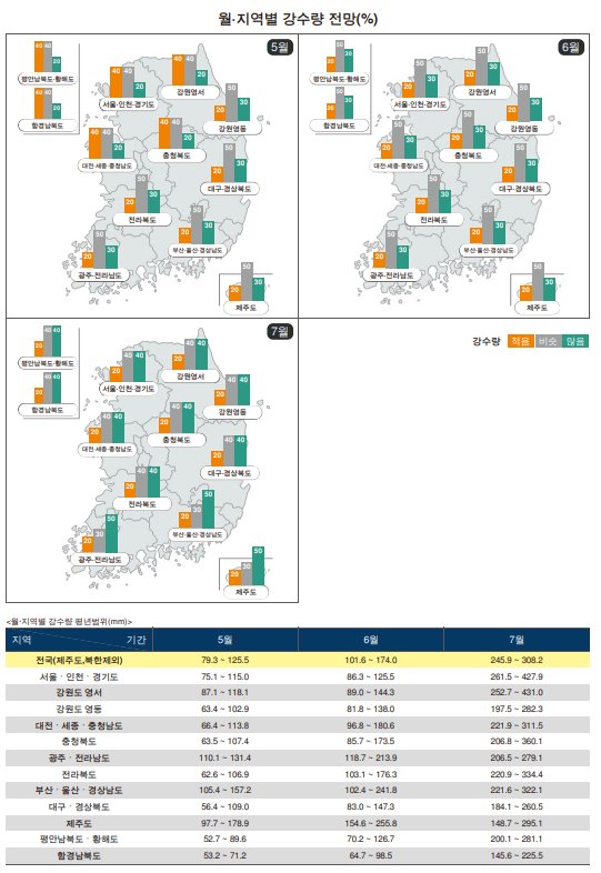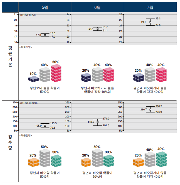 강수량 전망 : 5월과 6월은 평년과 비슷할 확률이 50%, 7월은 평년과 비슷하거나 많을 확률이 40%이다.