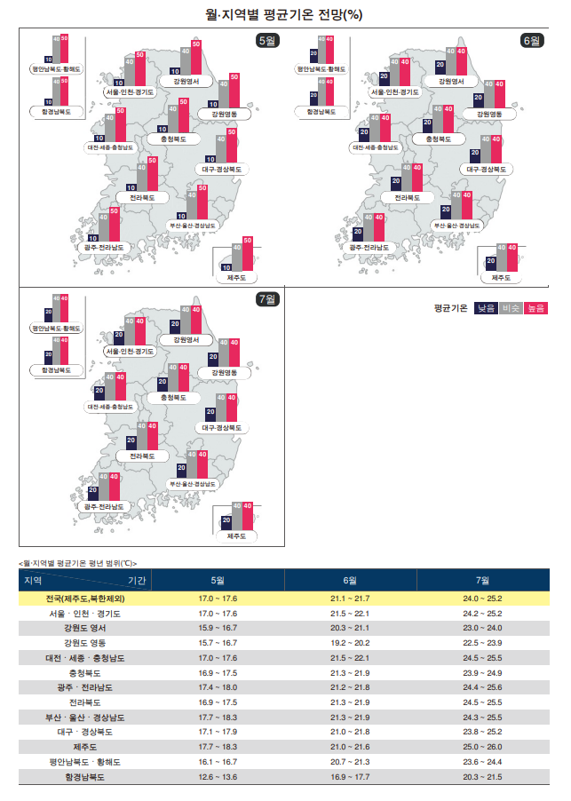 기온 전망 : 5월은 평년보다 높을 확률이 50%, 6월과 7월은 평년과 비슷하거나 높을 확률이 각각 40%이다.